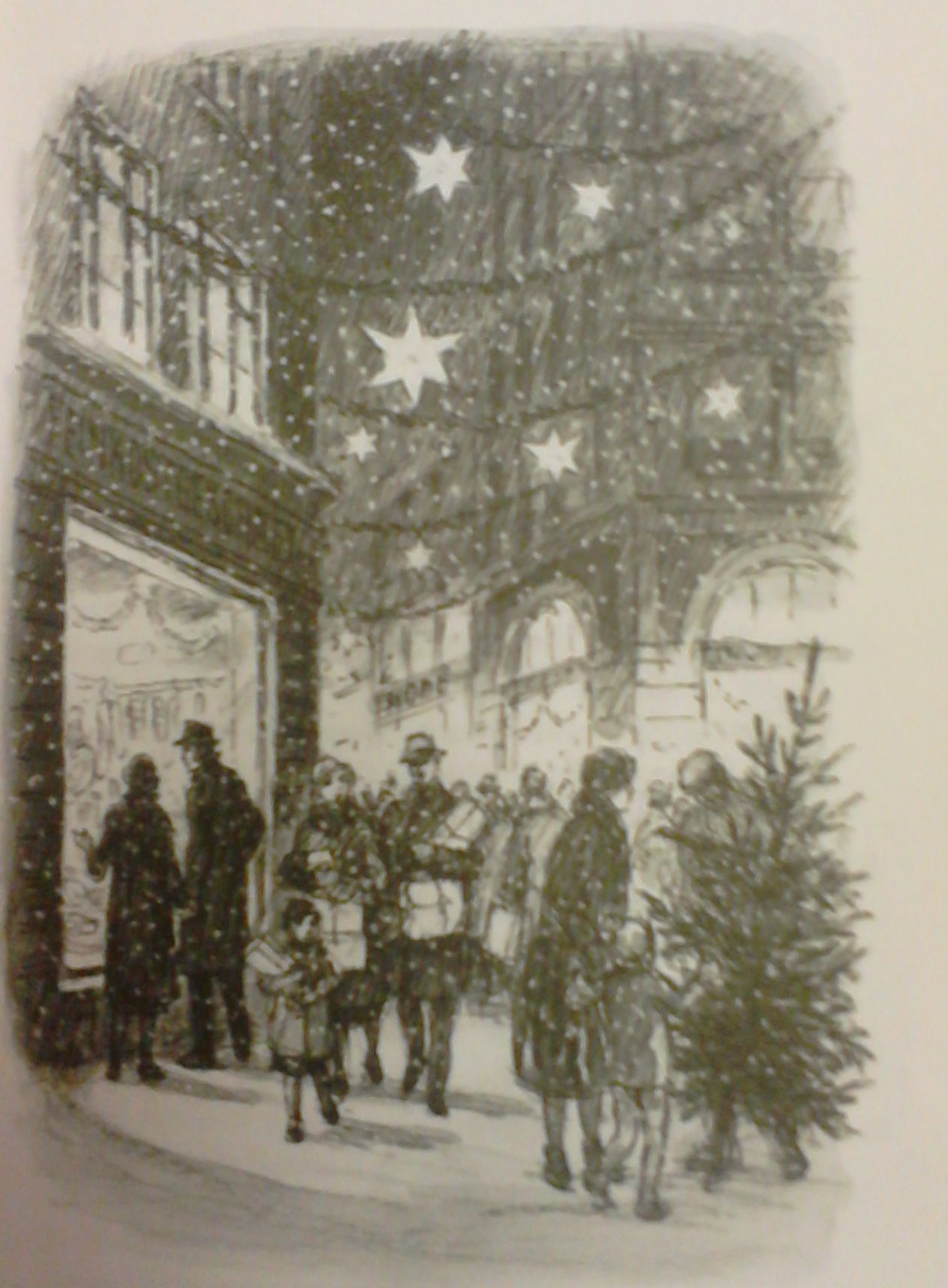 I am reading a simplified version of Hans Fallada’s »Erzählungen« and this illustration helped lead me astray in the syllabification of an unknown word: die Schaufenstern. Because, in addition to there being a large Schaufenster – “shop window” – at the left of the image, there are also a number of Sterne – “stars.” Now if I’d be paying closer attention to the word’s spelling, I would have noticed that since the plural of der Stern is die Sterne, the word was not indicating a sort of star – Schaufenstern as I was initially syllabifying it – but instead signaling the presence of a several of a specific type of window – Schaufenstern!